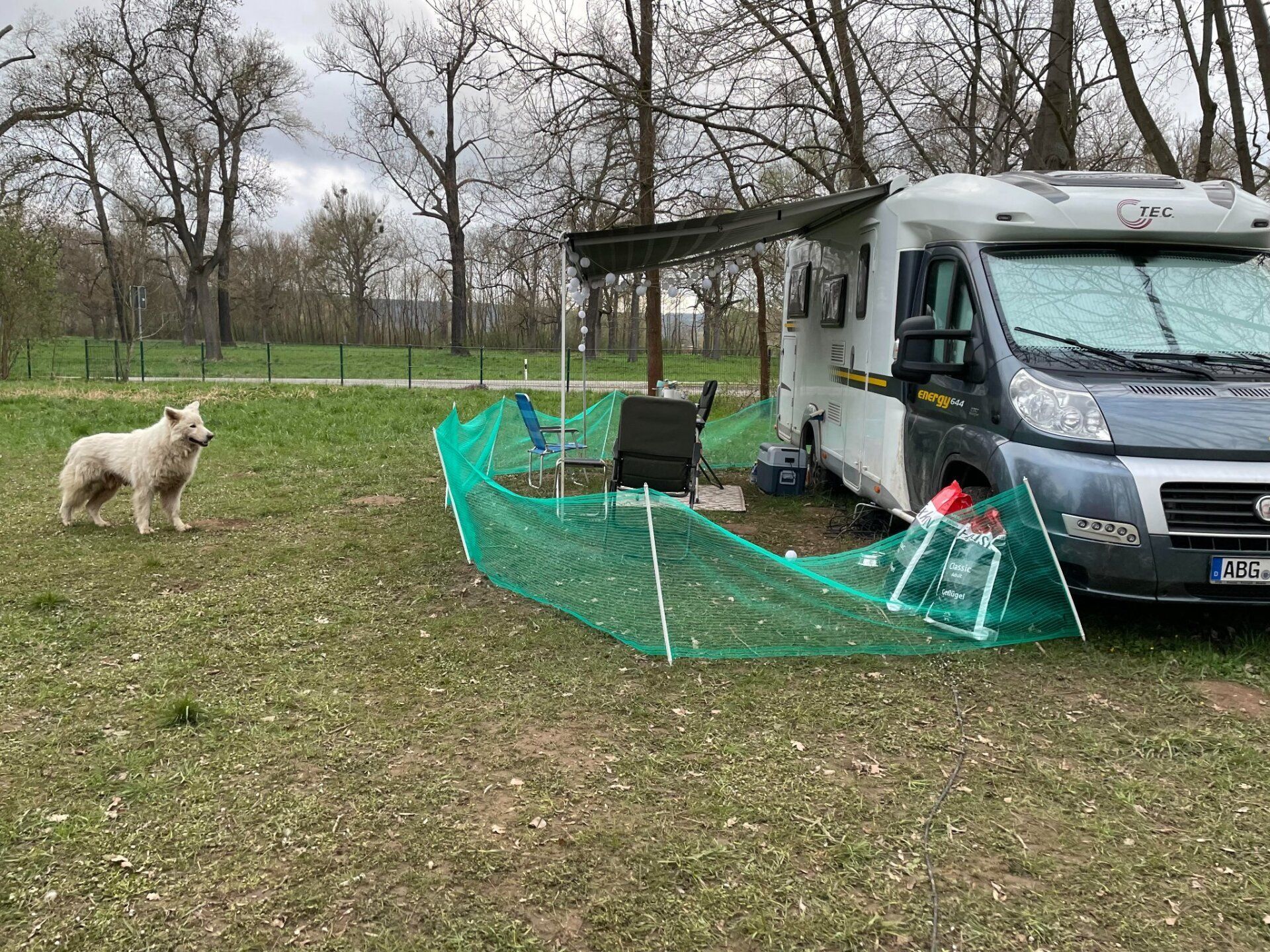 Hier ist ein Hund, der sich im Raum beschränkt (die Box) äußerst unangenehm fühlt und versucht, mich zu erwischen. Der Besitzer hat ihn uns 1 Stunde vorher ins Auto geladen. Er kann nach hinten nicht weg, wird auch seine Erfahrungen haben. Unsere Jungs finden die Hündin geil, ich aber habe mich mit mit einer Gießkanne bewaffnet, damit ich mich wehren kann. Und Frau Claudia stand ja auch daneben.